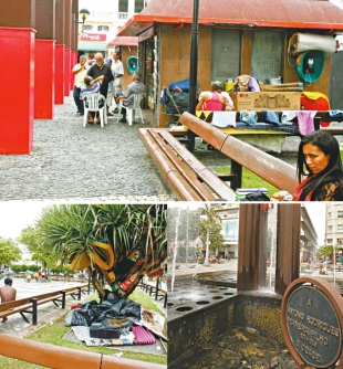 Espaço é usado como moradia, com lavagem de roupa e banho na fonte. Bancos são utilizadosLer mais