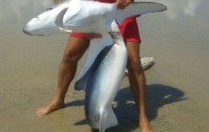 O animal, com cerca de 2 metros, estava enroscado na rede de pescadores, próximo à margemLer mais