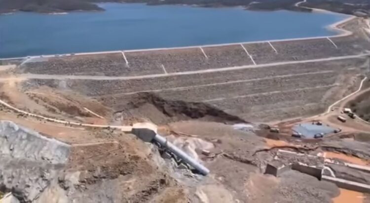 A obra de reparo na parede da barragem onde um duto rompeu na sexta-feira (21) em Jati,Ler mais