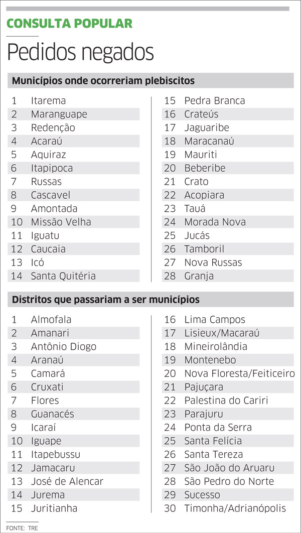 Depois de todos os estudos ficou atestado que 30 novos municípios poderiam ser criados no Ceará, e a Assembleia aprovou as respectivas resoluções autorizando o Tribunal Regional Eleitoral a realizar os plebiscitos.
